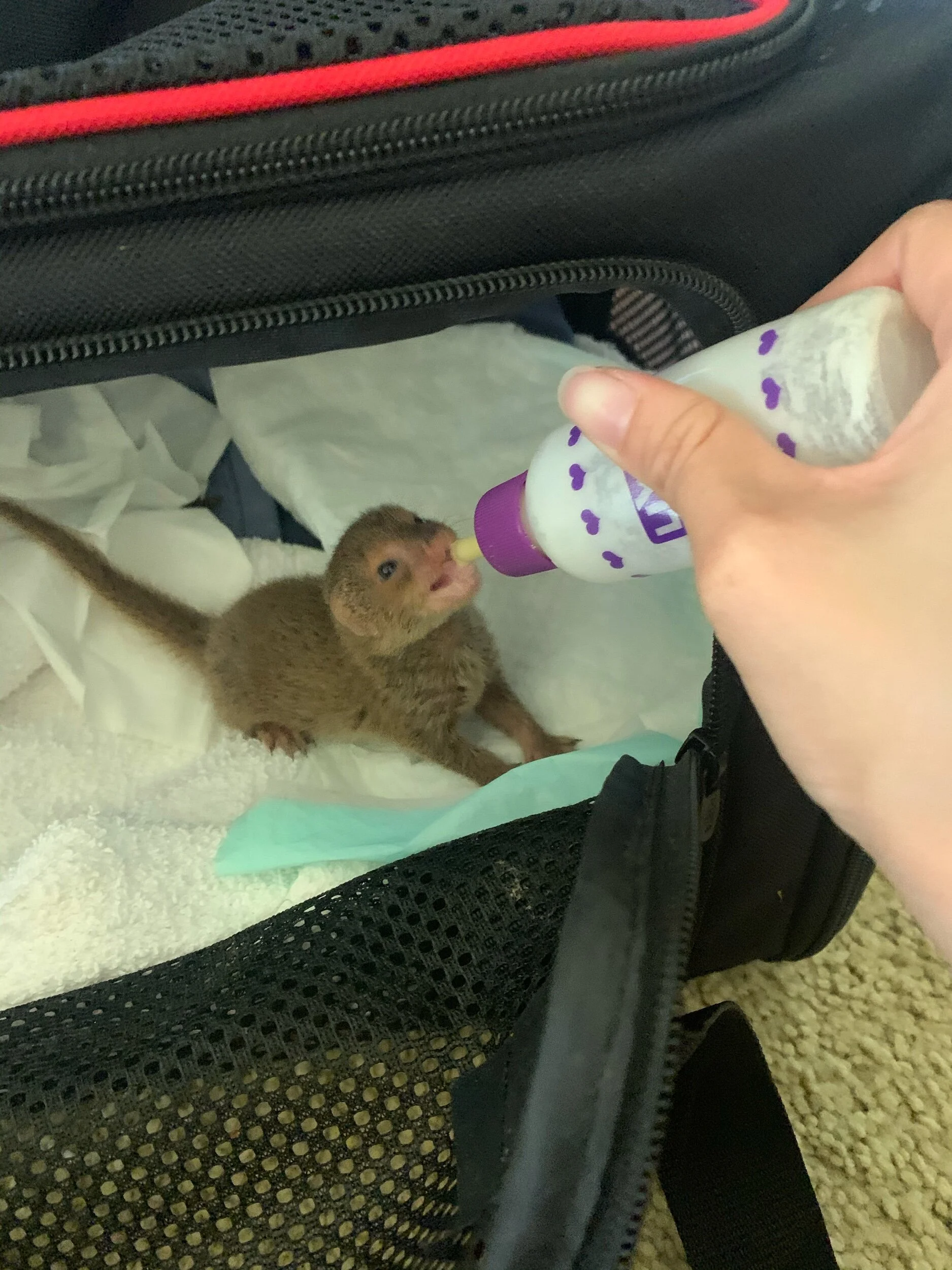 Mongoose babies need supplemental formula for growth. The best thing you can feed is KMR or PetLac kitten formula mixed with Soy Milk. You must mix equal parts formula with soy milk for the babies to be able to digest the formula. You can put the formula in a kitten bottle and be sure to feed the baby slowly- you do not want the baby to choke or drown on the formula.